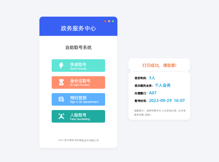 方便一些老年人或者紧急情况而设计的一项功能,办事人员无需进行身份验证,点击快速取号按钮、选择办事部门、办事事项后生成打印小票。