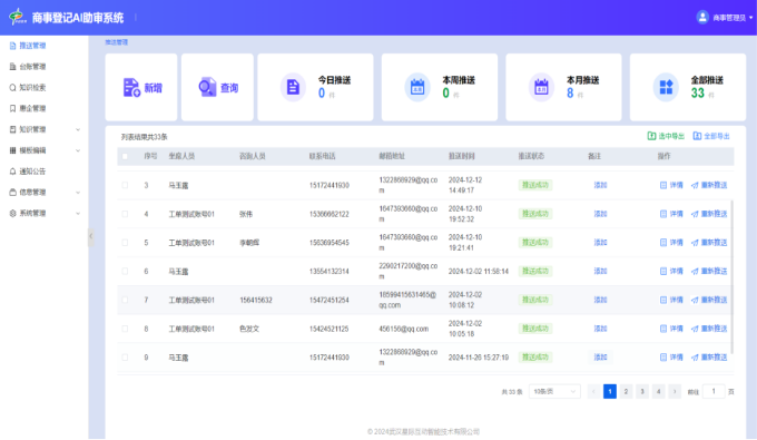 支持基于坐席人员、联系方式、推送状态等多条件组合查询,并内置异常工单自动识别与二次推送功能,优化任务执行效率。