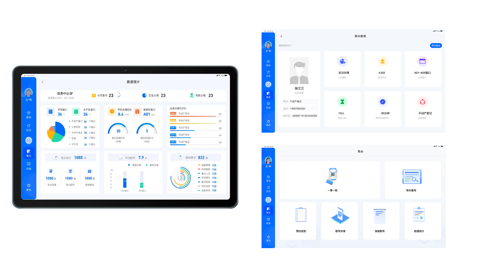 为导办员配备移动终端,实时查看全厅排队、预警、资源占用等情况,接收任务推送,支持案件查询、帮办指引、设备控制等功能,实现现场精准调度与快速响应。