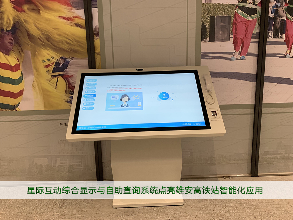 星际互动自助查询求助终端设备安装有自助查询求助系统前端软件,软件具有自助查询、自助求助等功能模块;通过与国铁、公共交通、气象预报、道路交通状况实时监测等系统提供的标准数据接口的对接,可为旅客提供高铁客站枢纽背景介绍、公告通知、自助查询、紧急求助、意见留言等关事项服务。